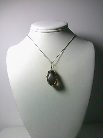 Description: A rather consistent translucent light smoky grey-brown; irregular teardrop shaped, translucent stone wrapped in 22-gauge sterling silver wire.