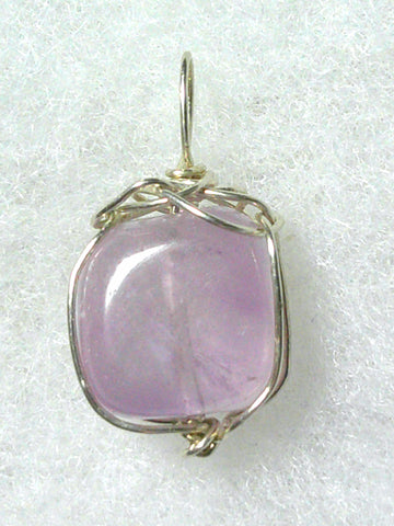 Description: Very light transparent purple; rounded square, near cubic shaped stone wrapped in 22-gauge sterling silver round wire.