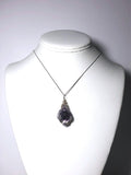 Description: Medium translucent purple within a clear quartz crystal; angular teardrop shaped stone crystal wrapped in 22 gauge sterling silver wire.