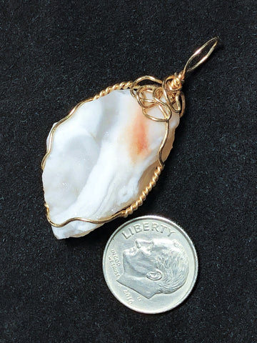 Description: A white to light gray-white sparkling stone with a splash of orange; rounded irregular triangle shaped, wrapped in 22 gauge sterling silver wire.