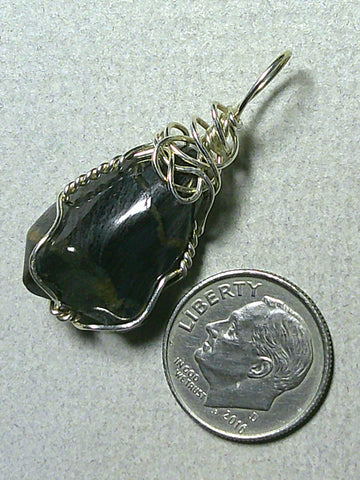 Description: Metallic dark charcoal gray with some very fine pitting and light yellow-tan coloration; rounded triangle shaped stone wrapped in 22-gauge sterling silver round wire.